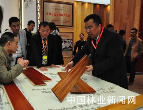 2011年3月上海某地板展会上,何贻信详细地向客户介绍"一拍即合"锁扣技术。这项技术能得到业内的支持和共同推广,是老何最大的心愿。